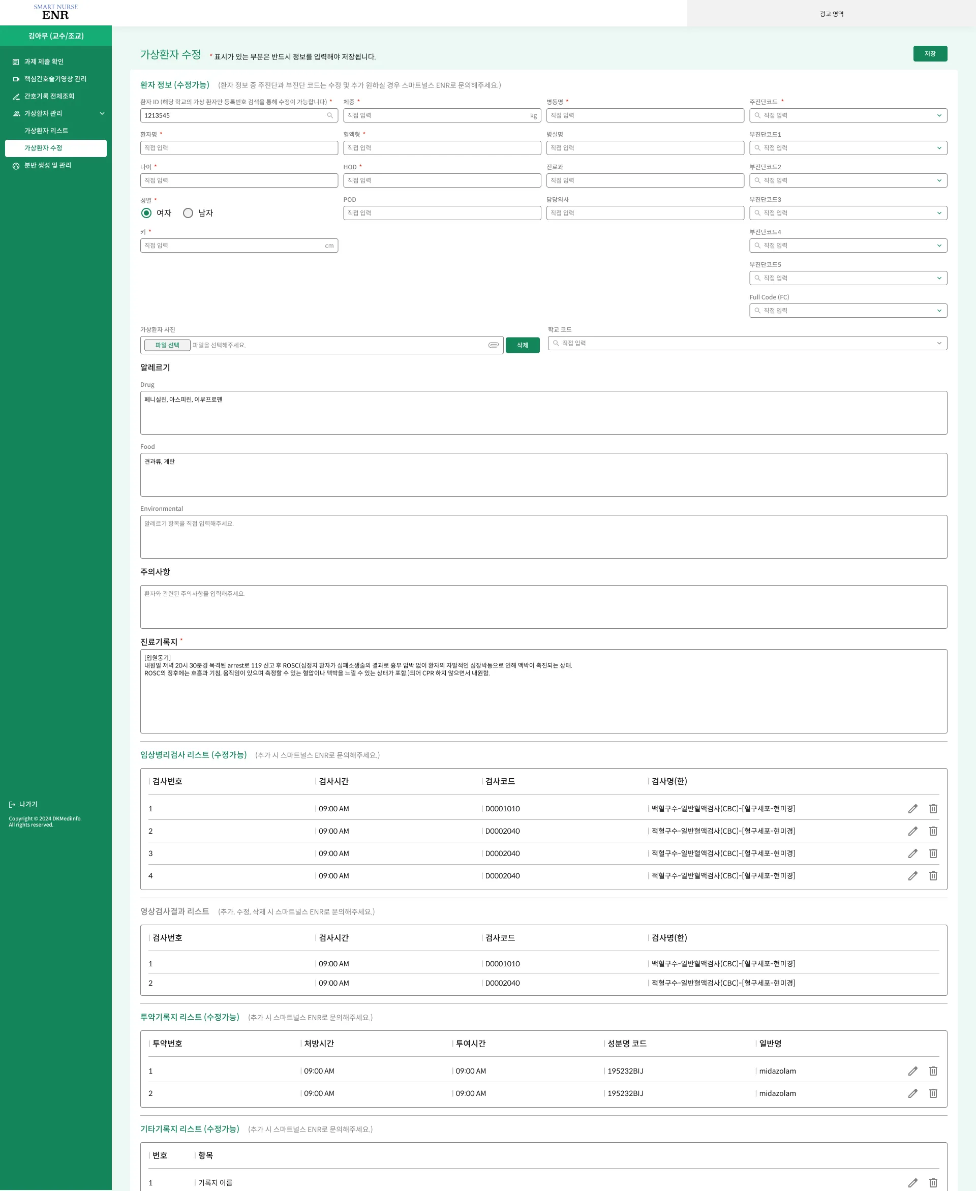 환자 정보 중 주진단과 부진단 코드를 제외하고 모두 수정가능합니다. 주진단과 부진단 코드의 수정 및 추가 원하실 경우 스마트널스 ENR로 문의 부탁드립니다.