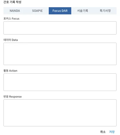 초점을 쓰는 칸에는 다음과 같은 내용을 기록: 환자의 관심과 행동, 치료와 반응, 교육, 상담, 모니터링, 일상 활동 관리, 기능적 건강양상 사정 등