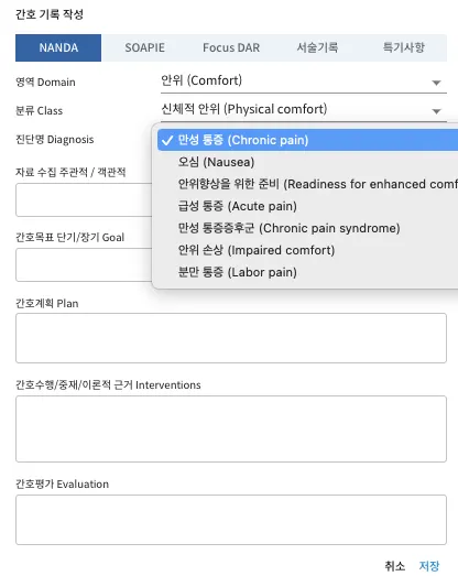 동시에 두 가지 문제 진술 금지 ex) 진단적 과정과 관련된 통증과 두려움(X)